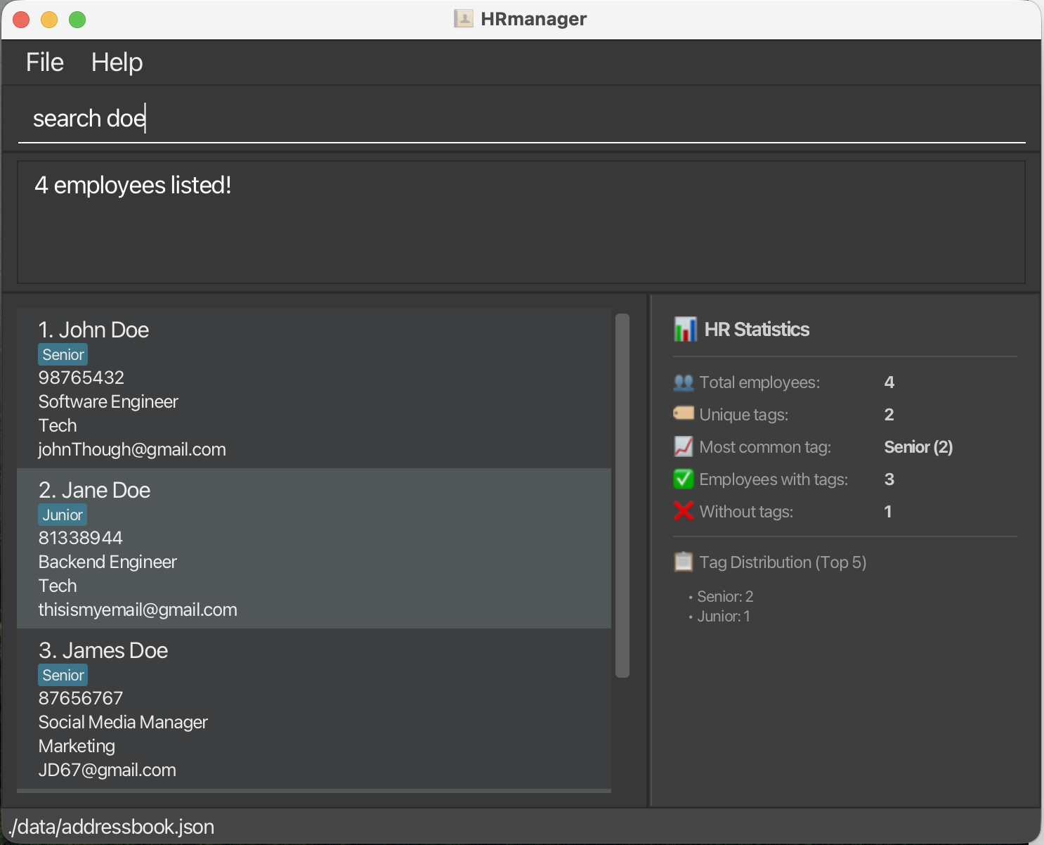 HRmanager is a desktop application for managing employee records. While it has a GUI, most interactions are optimized for a CLI (Command Line Interface) workflow.