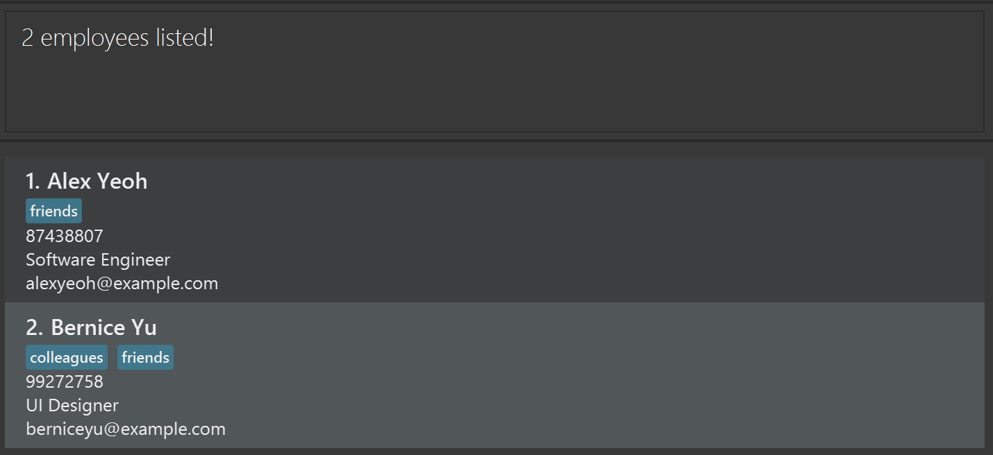 | Add | add n/NAME p/PHONE_NUMBER e/EMAIL r/ROLE d/DEPARTMENT [t/TAG]… e.g., add n/James Ho p/22224444 e/jamesho@example.com r/Software Engineer d/Engineering t/friend t/colleague |